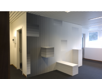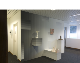 Wandarbeit Credit Suisse Kriens, 2015 mit den Werken «PET-Kelch», «Timber», «Bildmarmor 21.3» und «Twister»